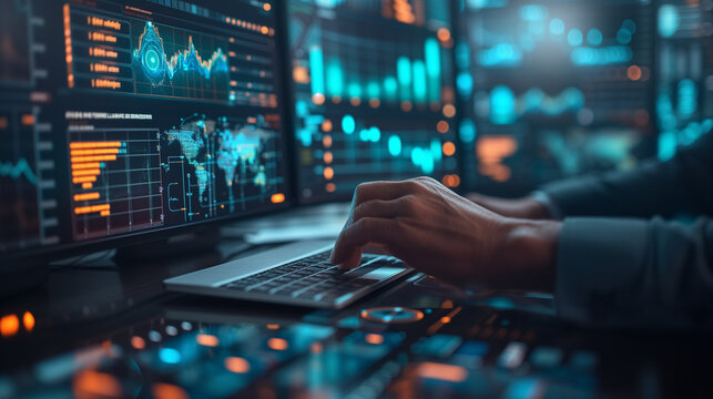 Programmer analyzing complex digital data using futuristic technology interface laptop. High tech concept for software development, cyber security, global business finance, AI analytics, networking.