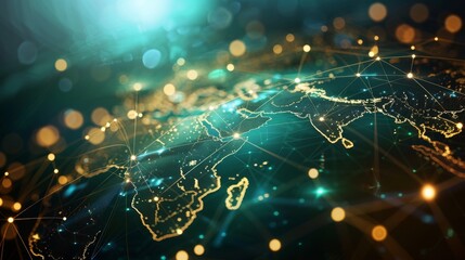 Digital world map with glowing lines and nodes representing global network connectivity and data exchange.