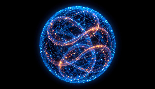 Abstract glowing sphere with interconnected lines and curves against a black background view