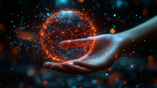 Visual representation of a futuristic global network with planet Earth composed of glowing elements set against a dark blue backdrop