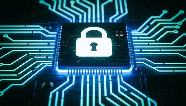 Secure digital padlock on futuristic circuit network background, representing cybersecurity protection, encrypted data systems, online privacy and advanced information security technology