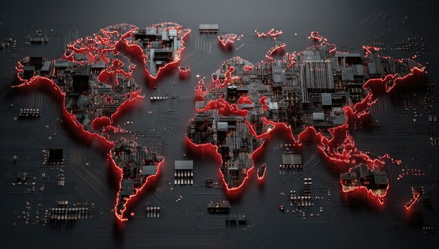 A world map formed from a circuit board, its continents outlined in glowing red, set against a dark gray background