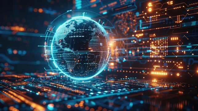 A close-up view features a world globe set on a computer motherboard, emphasizing the blend of technology and global connectivity in high detail