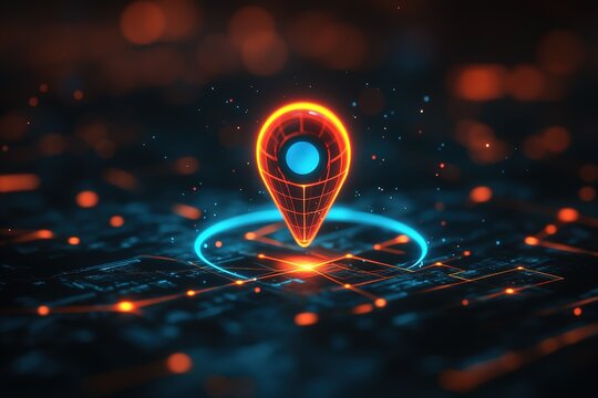 Glowing location pin on a circuit board, representing digital mapping and geolocation technology.