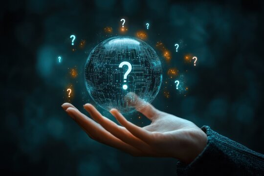 outstretched human hand holding a glowing digital globe with circuit patterns surrounded by floating question marks, evoking curiosity and uncertainty