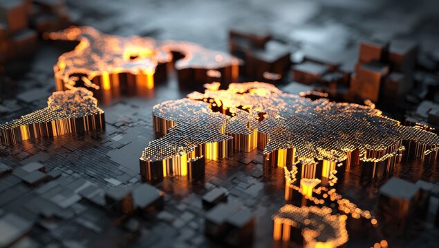 Glowing world map with digital circuit pattern in blue and pink on a dark blurred background