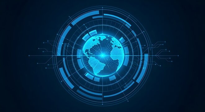 A glowing digital globe interconnected by luminous lines, symbolizing technology, data, and connectivity in a futuristic environment.