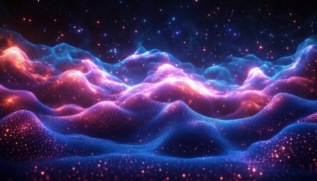 Abstract background with glowing pink, blue particle waves. Shiny glitter dust forms dynamic digital landscape on dark backdrop. Futuristic design with flowing energy motion, sparkling bokeh effect.