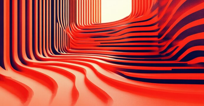 Flowing red and dark blue striped ribbon corridor with curved layered walls and luminous opening, a dynamic futuristic abstract interior evoking movement and energy