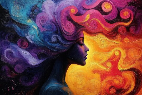 Vibrant swirling brushstrokes split into cool blue and warm orange halves conveying dynamic energy and dreamy emotion