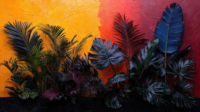 Lush, stylized tropical foliage bursts from a dark base against a vibrant split background of orange and red textures