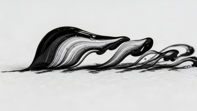 Ink flows in a fluid dynamic motion on a white surface creating a mesmerizing pattern of black and gray swirls