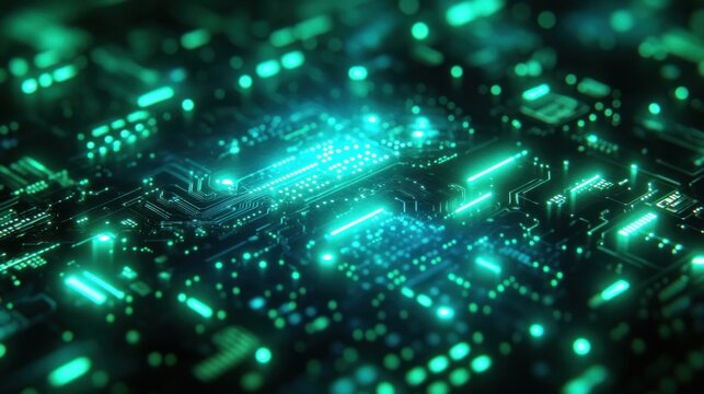 Close-Up of Modern Circuit Board Pattern Illuminated with Tiny LED Lights Futuristic Technology Design Abstract Digital Circuitry