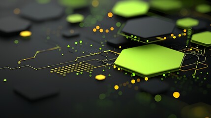 Close-up of glowing green hexagonal circuit board structures with connecting points emitting soft light in a dark futuristic setting