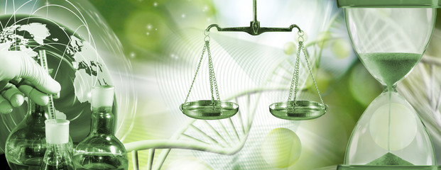 image of chemical flasks, stylized ball, hourglass, open book on biotechnological background