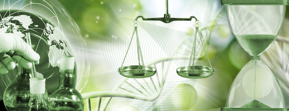 image of chemical flasks, stylized ball, hourglass on a biotechnological background