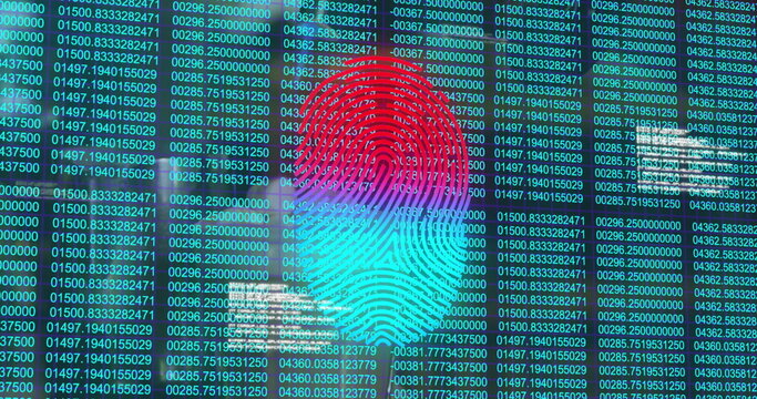 Displaying stylized fingerprint graphic overlaying code columns on security interface, grid lines