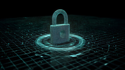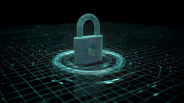 Cybersecurity padlock on data grid: An abstract composition visualizes a digital padlock, symbolizing data protection, resting on a network grid.