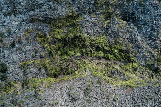 Green moss grows on cement wall. Aged concrete facade with damage spots. Mossy texture covers dirty surface. Damp environment creates unique texture. Rich plant expands on wall in eco garden.