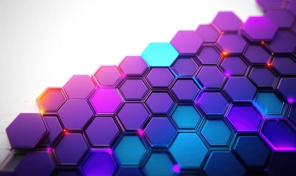 3d hexagonal tiles forming a glossy honeycomb grid with neon purple, blue and cyan gradients, small glowing nodes and deep shadows conveying a sleek futuristic energy