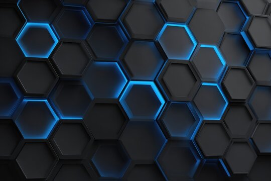 Abstract dark blue background with glowing neon hexagonal grid patterns