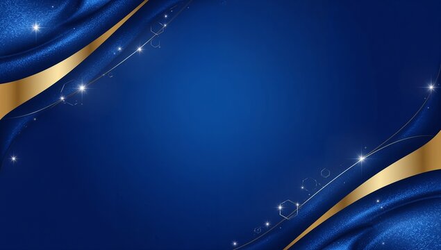 A professional abstract blue background with elegant golden curved lines sweeping across the edges, layered deep blue gradients blending seamlessly, subtle geometric hexagonal patterns in the center
