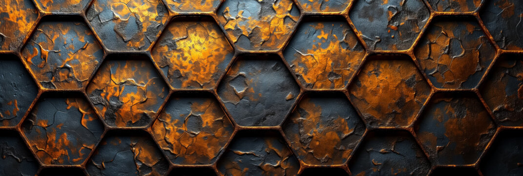 Rustic black and orange textured honeycomb pattern background, abstract geometric design, ideal for industrial or Halloween themed projects