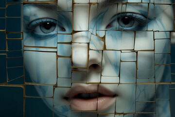 Abstract pixelated face portrait. Fragmented identity and blurring of reality. Conceptual and contemporary makeup.