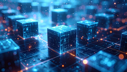 Futuristic digital abstract background with glowing circuits and data visualization. The image evokes the concepts of technology, science, and the digital age.