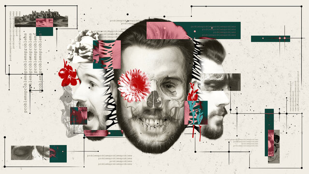 Collage with multiple male profiles, skull, flowers, and abstract elements on abstract background. Conceptual art. Healing journey from trauma to rebirth. Psychology, surrealism, health, science