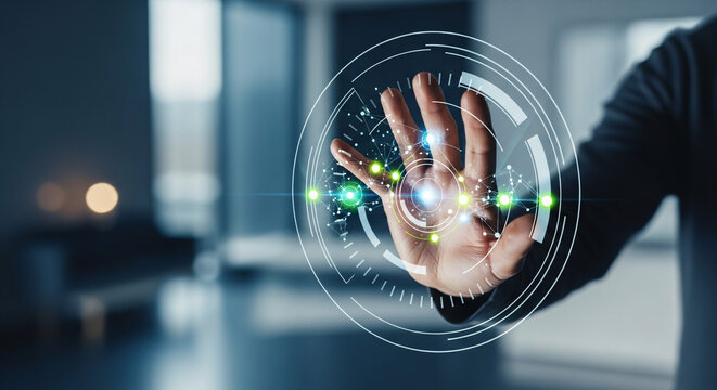 Hand Interacting with Holographic Network Interface.