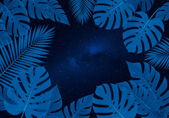 Vibrant green tropical leaves frame a blue background, creating a refreshing and natural design layout.
