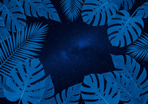 Blue botanical art features a pattern generic painted tropical leaves arranged on a matching blue background.