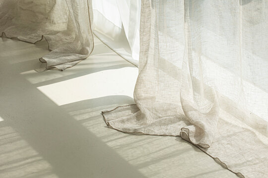 Soft sunlight filtering through delicate curtains, creating shadows of leaves and warm hues. Ideal for conveying tranquility in home decor or interior design contexts.