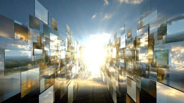 Abstract holographic projections of a futuristic cityscape illuminated by bright sunlight, showcasing digital innovation.