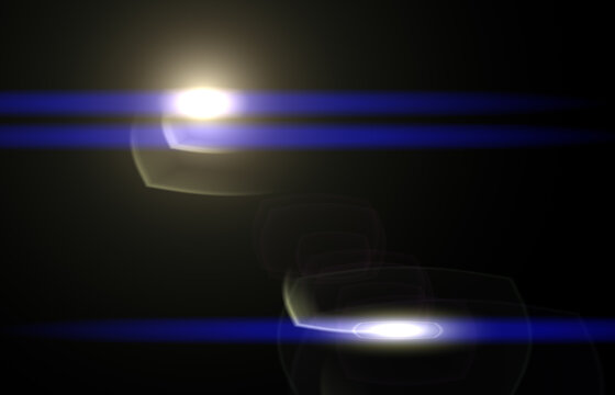 Lens flare, blue glow light effect on black. Image of rays light effects, overlays or flare for creative design. Screen blending mode. Collection of abstract sunburst, flare, and glare over backgro...