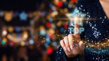 High level planning star rating success concept finger touch glowing top icon magical light trail festive bokeh background