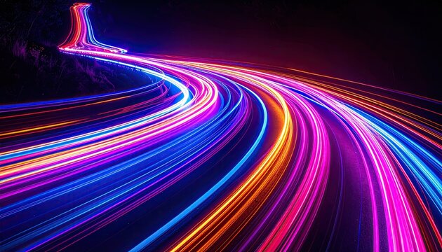 Neon light trails curve and flow along a road, creating vibrant streaks against the dark backdrop