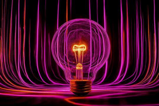 Lightbulb, lit, with energy trails emanating, dark background