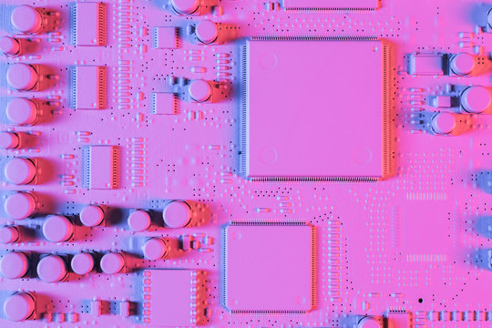 Macro led die array glowing on production bench with multicolor bokeh and reflective grid