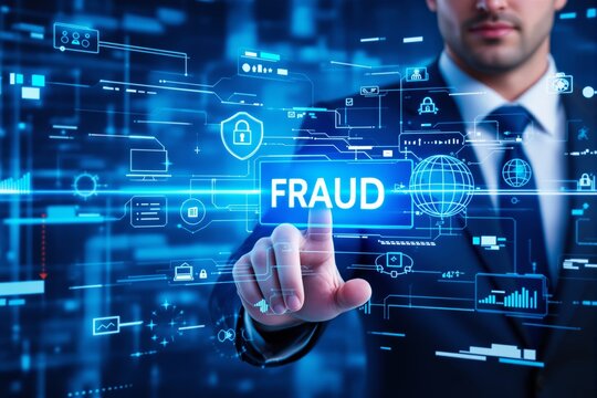 Businessman pointing at fraud concept on digital interface.