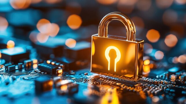Glowing Gold Padlock On Blue Circuit Board