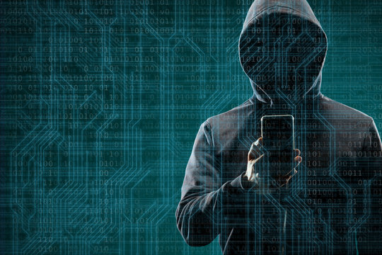 Anonymous computer hacker with a smartphone over abstract digital background. Obscured dark face in mask and hood. Data thief, internet attack, darknet fraud, dangerous viruses and cyber security.