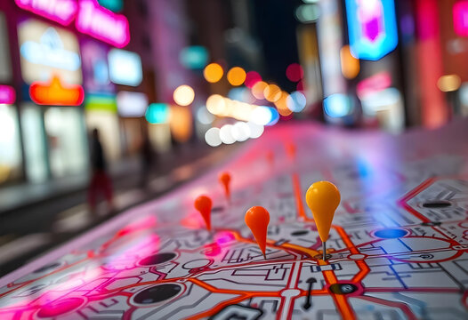 Close-up of a city map highlighted with glowing neon blue and pink lights, featuring a red navigation pin element, intricate abstract geometric patterns, and a softly blurred background