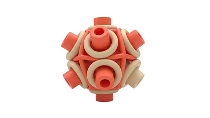 An Abstract 3D Geometric Structure Composed of Red and Tan Cylindrical and Circular Elements Against a Transparent Background