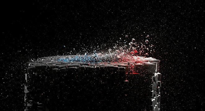 Digital fragmentation and breakdown of order. Chaotic particles scatter across a dark, diminishing structure, representing irreversible change, system, irreversible, geometric