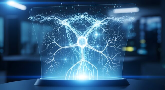A glowing holographic human brain displayed in a futuristic glass cylinder with digital interface elements and blue energy effects.