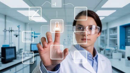 Innovative scientist creating digital process in laboratory. A scientist interacts with virtual elements in a modern lab setting showcasing advanced technology
