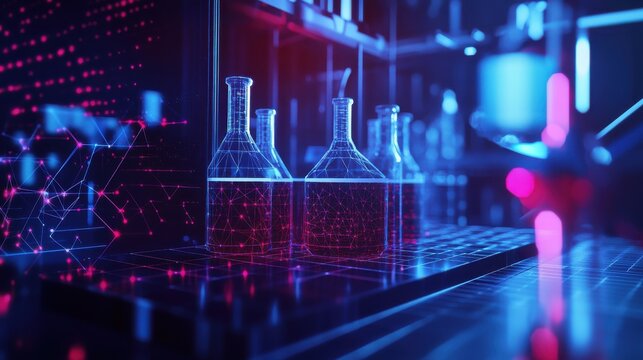 Two scientists in a close-up shot analyzing data on a holographic display in a high-tech medical research facility their expressions showing deep concentration