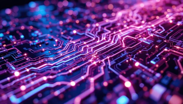 Close-up of a network of circuits glowing in bright blues and purples, against a dark, sleek metal backdrop.